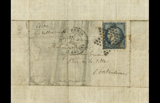 One of them has been discovered by the National Archives. It was penned in French on December 6, 1870 by a man named Charles Mesnier (or Mesmier) to his mother, care of Monsieur Grussin (or Grossin) at 8 Place de la Ville, Pont-Audemer, in Normandy.