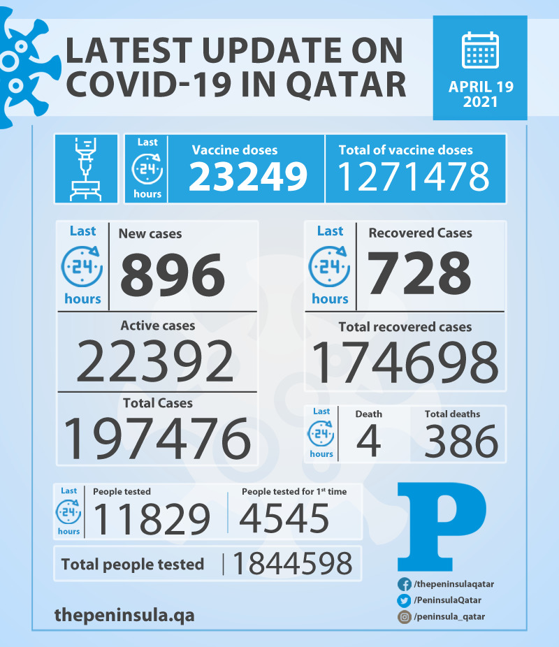 Doha: Ministry of Public Health (MoPH) today reported 896 new cases of coronavirus (Covid-19) and 728 people recovered from the virus in the last 24 hours, bringing the total number of people recovered in Qatar to 174,698.