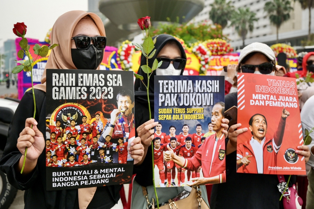 Fans attend a victory parade for Indonesia's football team in Jakarta on May 19, 2023, after they won the gold medal in the men's event at the 32nd Southeast Asian Games (SEA Games) in Phnom Penh. (Photo by Bay Ismoyo / AFP)