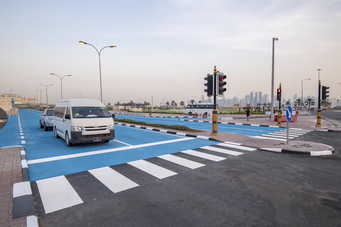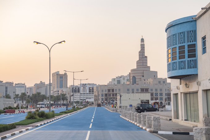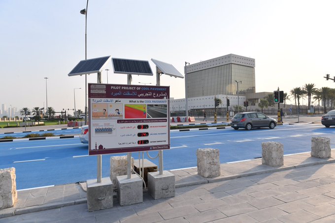A blue road near Souq Waqif has been intriguing visitors for some time. Now, Ashghal has come out with an explanation for the colourful pavement on parts of Abdullah bin Jassim Street by Souq Waqif – it is a ‘pilot project for cool pavement’.