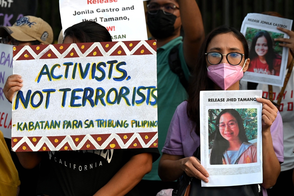 Protesters hold placards that calls for the release of environmental activists Jhed Tamano and Jonila Castro during a demonstration outside the Commission of Human Rights, in Quezon on September 19, 2023. (Photo by Jam Sta Rosa / AFP)