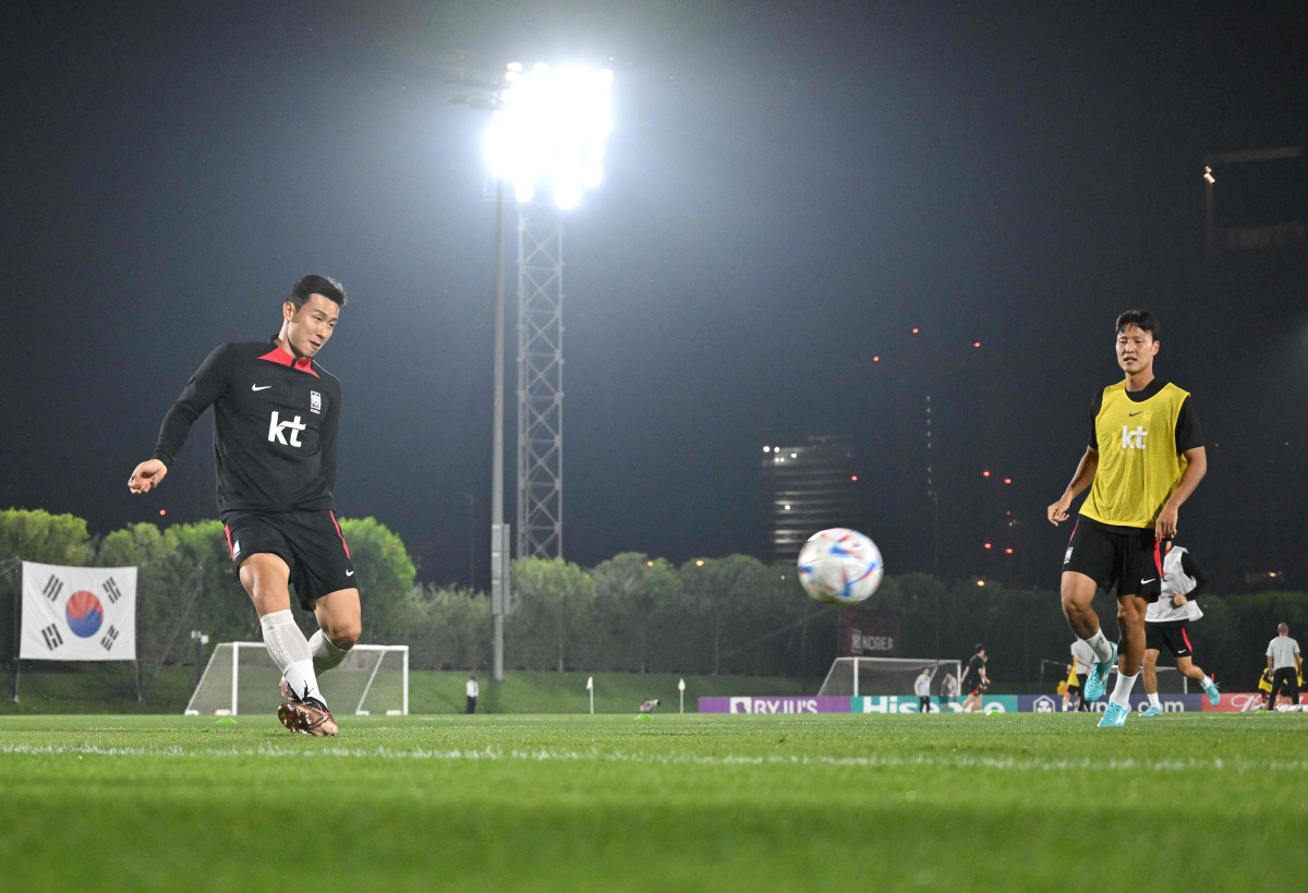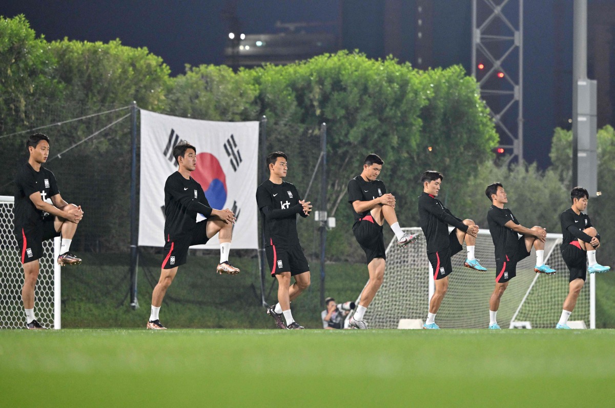 South Korea’s players take part in a training session at Al Egla Training Site 5 in Doha, yesterday. AFP