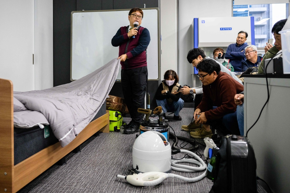 This photo taken on November 28, 2023 shows Jang Young-jin (L), CEO of pest control company Bugs Clean, demonstrating how to treat a mattress affected by bedbugs at the Korea Pest Control Association (KPCA) in Seoul. Photo by Anthony WALLACE / AFP
