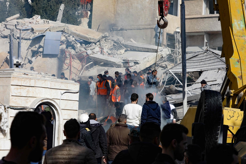 Rescuers gather in front of a building destroyed in a reported Israeli strike in Damascus on January 20, 2024. (Photo by Louai Beshara / AFP)