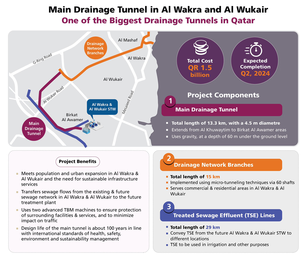 Al Khayareen said that the main tunnel will accommodate the drainage flows from the current and future drainage network in different areas in Al Wakra and Al Wukair, and transfer these flows to Al Wakra and Al Wukair Sewage Treatment Works, which will have an initial capacity of 150 million liters per day and is set to be the first project in the country to be implemented through Public-Private Partnership (PPP).