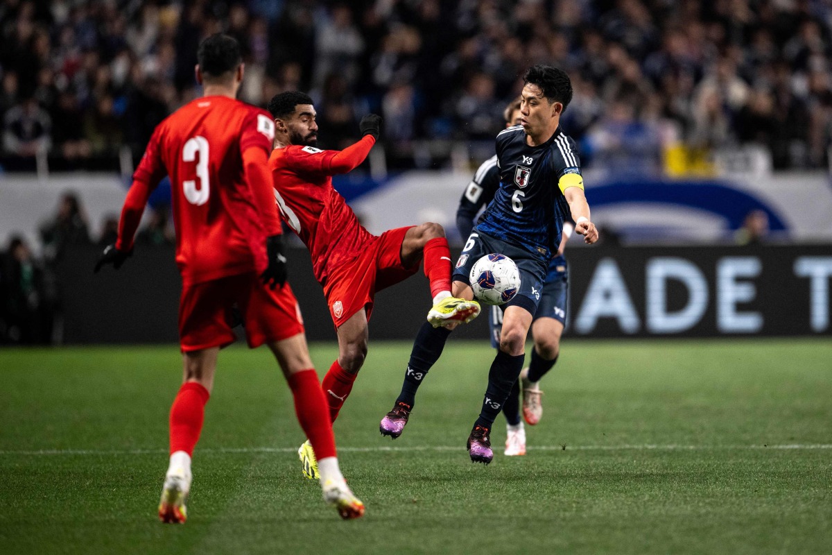 Japan's Wataru Endo (R) controls the ball during the 2026 FIFA World Cup Asian qualification football match between Japan and Bahrain in Saitama on March 20, 2025. (Photo by Philip FONG / AFP)