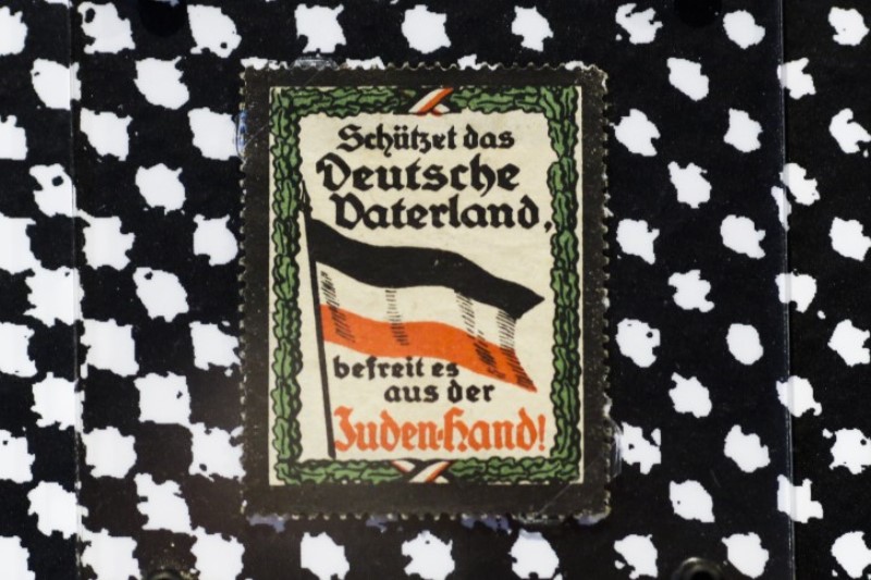 The show at the German Historical Museum in Berlin features about 600 stickers and replicas, racist and anti-racist. Among the earliest exhibits is a mock train ticket from 1893 offering Jews a trip "to Jerusalem, one way" and a Jewish group's 1900 sticker proclaiming that "anti-Semitism is the socialism of fools."
