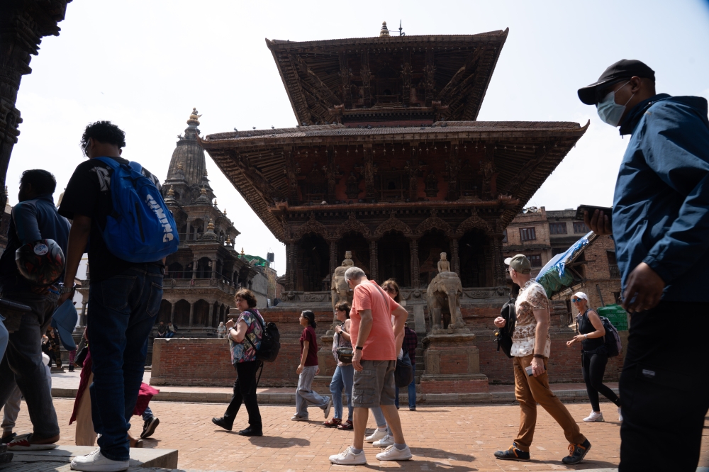Tourists visit Patan Durbar Square, a UNESCO world heritage site, in Lalitpur, Nepal, April 18, 2025. (Photo by Hari Maharjan/Xinhua)