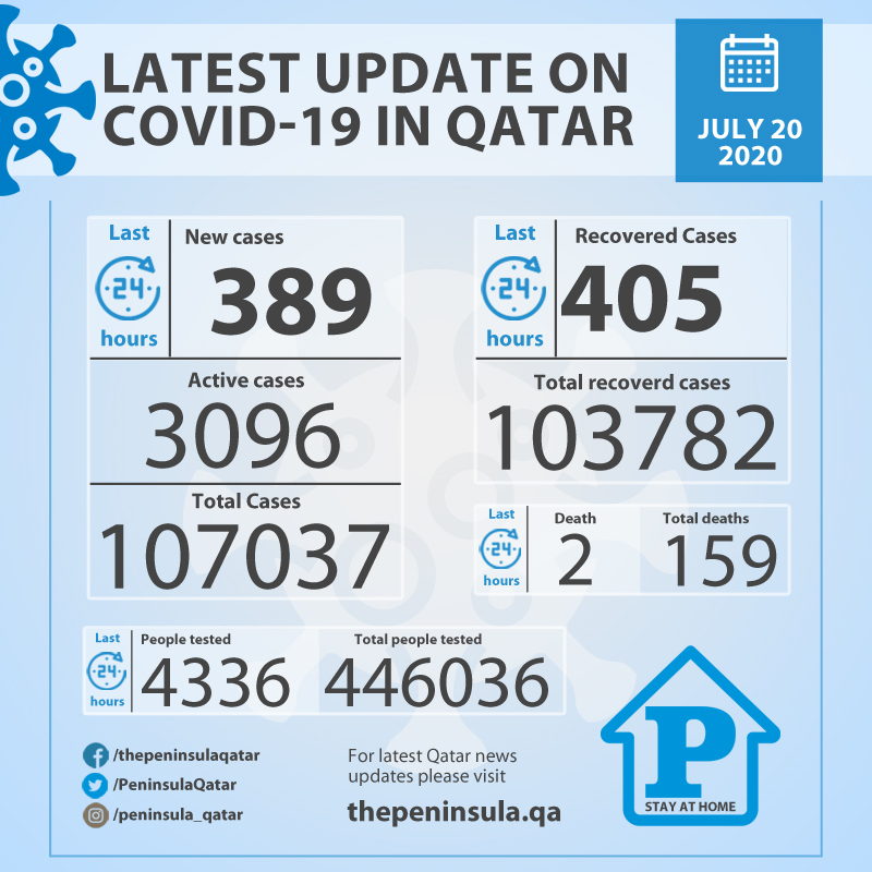 Qatar reports 2 deaths and 389 cases on July 20