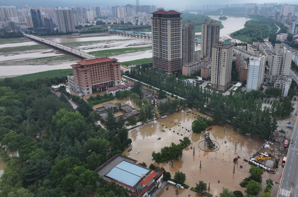 An aerial drone photo taken on July 18, 2024 shows a flood-hit area in Baoji City, northwest China's Shaanxi Province. (Xinhua/Zhang Bowen)
