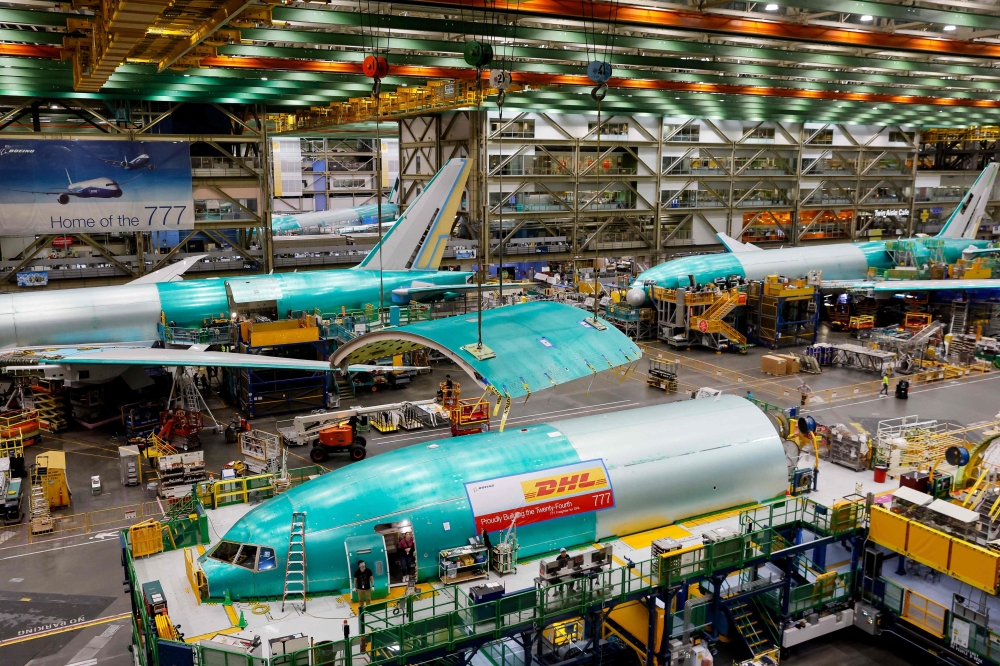 Boeing employees build 777 aircrafts under production at the Everett Production Facility on June 26, 2024 in Everett, Washington. (Photo by Jennifer Buchanan / POOL / AFP)