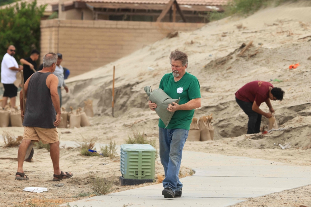 Residents shovel and fill sandbags from the desert along the side of the road as the path of Hurricane Hilary heads north toward southern California, in Indio, California, August 19, 2023. Photo by DAVID SWANSON / AFP