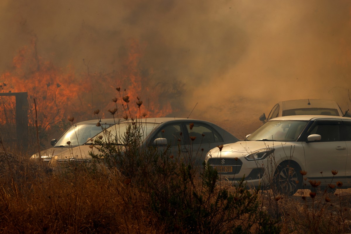 A fire rages behind cars on a hill after rockets were fired from southern Lebanon, on the outskirts of Rosh Pinna in the Upper Galilee on October 20, 2024. Photo by Jalaa MAREY / AFP.