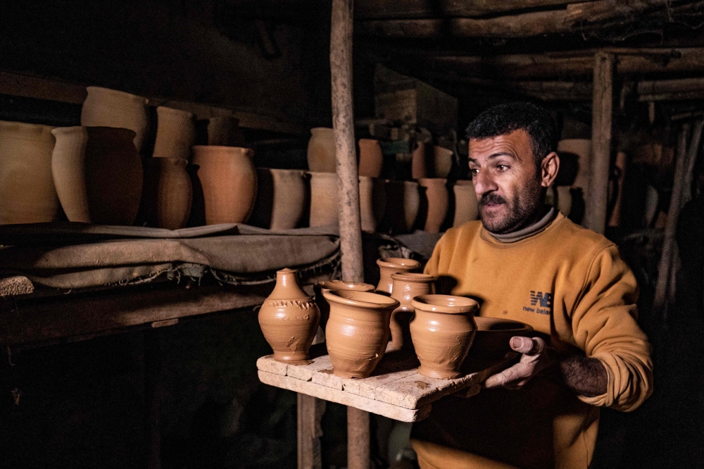 Qamishli, Syria: Inside a dusty and dark workshop on the banks of the Jaghjagh river in northeast Syria, Misak Antranik Petros uses an ancient pottery wheel to throw different shapes from clay.