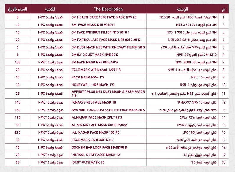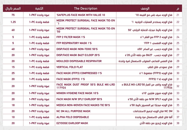 Doha: Ministry of Commerce and Industry has fixed the maximum prices for selling face masks as per the published list.
