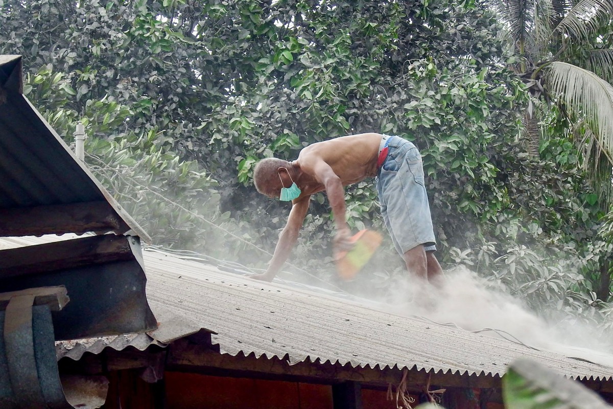 A villager cleans volcanic ash from the roof of his house in Riangrita village, East Flores, East Nusa Tenggara, on March 21, 2025, after Mount Lewotobi Laki-Laki volcano erupted. Photo by Arnold Welianto / AFP