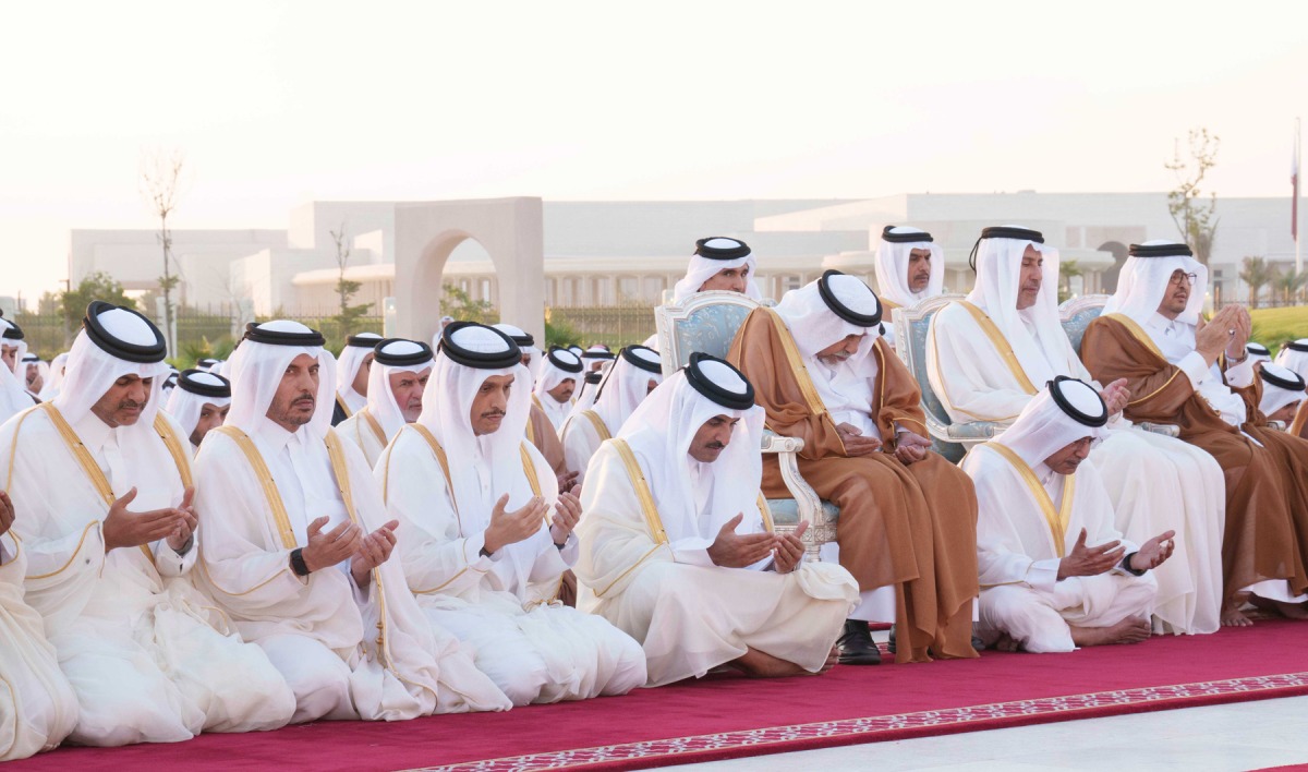 Doha: The Amir HH Sheikh Tamim bin Hamad Al-Thani performed Eid Al Fitr prayers along with citizens at Lusail praying area this morning.