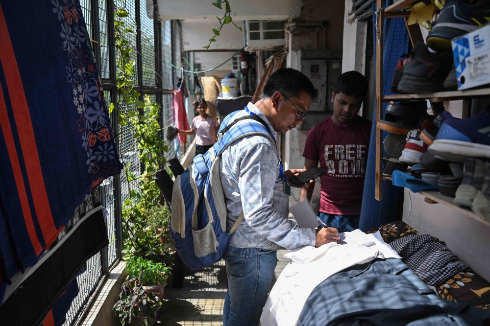 Lalit Verma (L), a census enumerator, collects details during a door-to-door survey in New Delhi on April 20, 2026. (Photo by Arun Sankar / AFP)