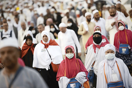 Pilgrims arrive for the Maghrib prayer at the Grand Mosque in the holy city of Makkah yesterday. The annual Haj pilgrimage begins tomorrow, and more than a million faithful have already flocked to Saudi Arabia in preparation for what will for many be the highlight of their spiritual lives.
