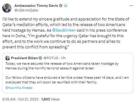 Resharing US President's post on the release of the hostages, Ambassador Davis wrote, "I’d like to extend my sincere gratitude and appreciation for the State of Qatar’s mediation efforts, which led to the release of two Americans held hostage by Hamas."