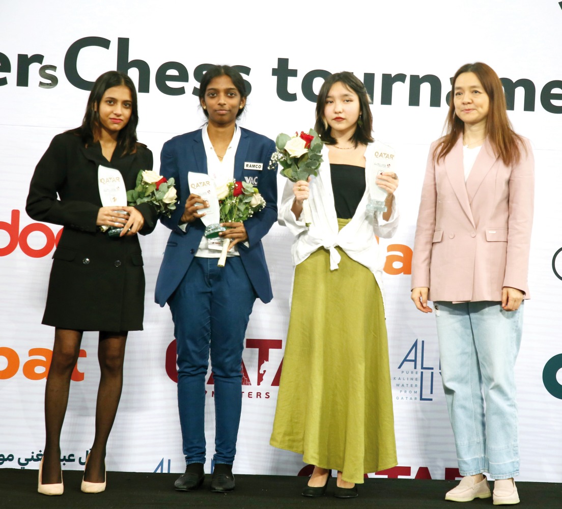 Women's title winner Vaishali Rameshbabu (second left) with second placed Divya Deshmukh and third place winner Alua Nurmanova and an official.