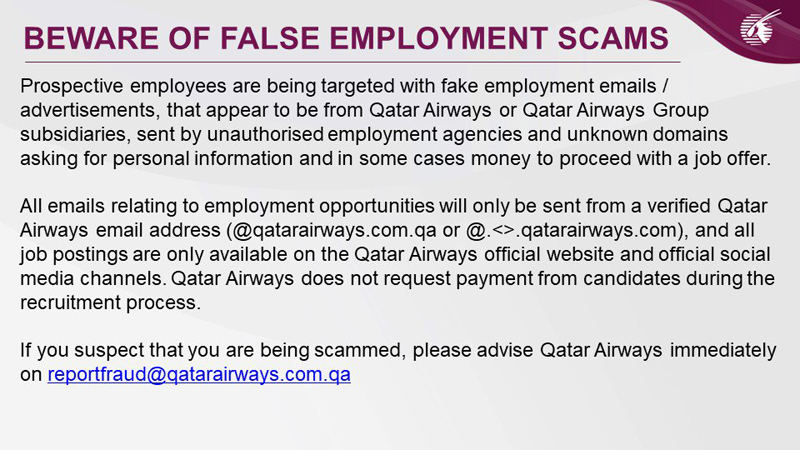 “All emails relating to employment opportunities will only be sent from a verified Qatar Airways email address (@qatarairways.com.qa or @.<>.qatarairways.com),” the airline clarified.