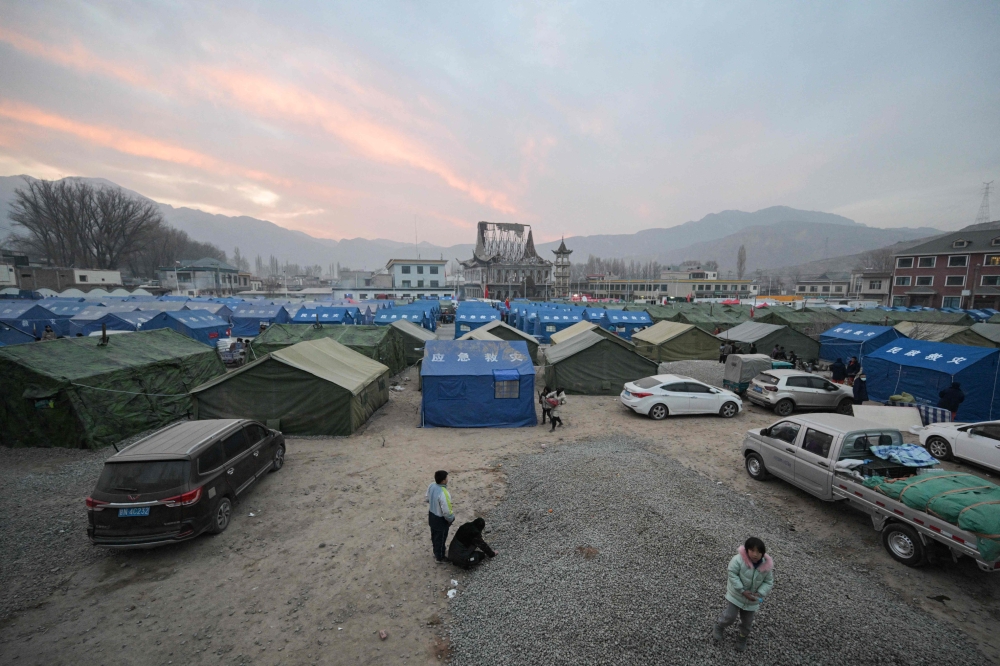 People are seen at a temporary shelter in the main square in Dahejia in Jishishan County in northwest China's Gansu province on December 20, 2023. (Photo by Pedro Pardo / AFP)