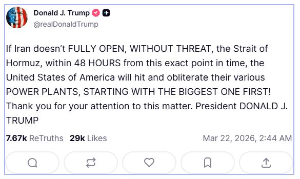 "If Iran doesn't FULLY OPEN, WITHOUT THREAT, the Strait of Hormuz, within 48 HOURS from this exact point in time, the United States of America will hit and obliterate their various POWER PLANTS, STARTING WITH THE BIGGEST ONE FIRST!" Trump posted on his Truth Social platform.