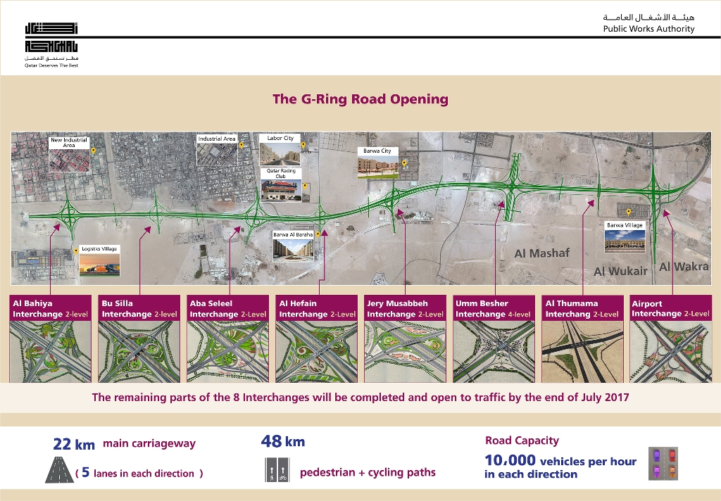 The total cost of the G-Ring Road project is approximately QR 4 billion. The remaining works, which comprise parts of the eight interchanges of the project, are scheduled to be completed by the end of July 2017.