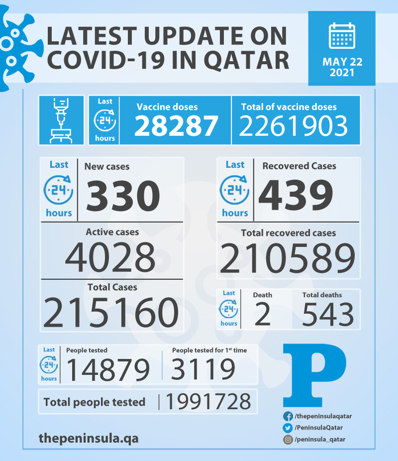 Doha: Ministry of Public Health (MoPH) today reported 330 new cases of coronavirus (Covid-19) and 439 people recovered from the virus in the last 24 hours, bringing the total number of people recovered in Qatar to 210,589.