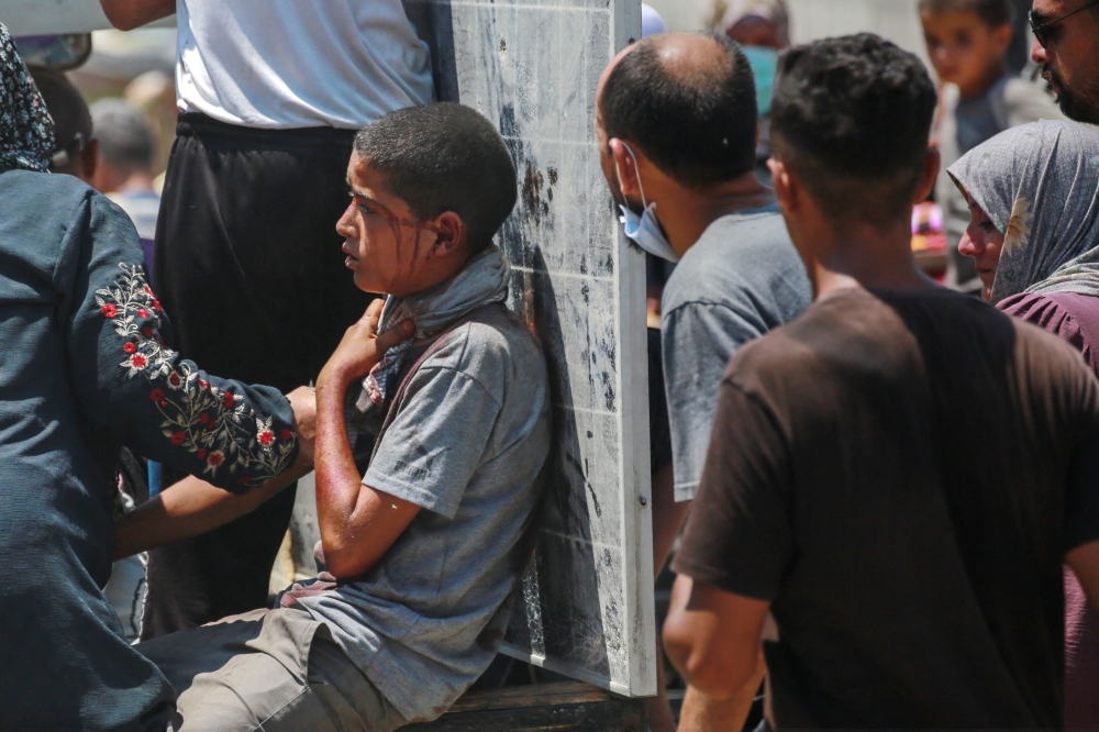 A Palestinian boy bleeds after sustaining wounds during Israeli bombardment while civilians fled the eastern districts of Khan Yunis on July 22, 2024. (Photo by Bashar Taleb / AFP)