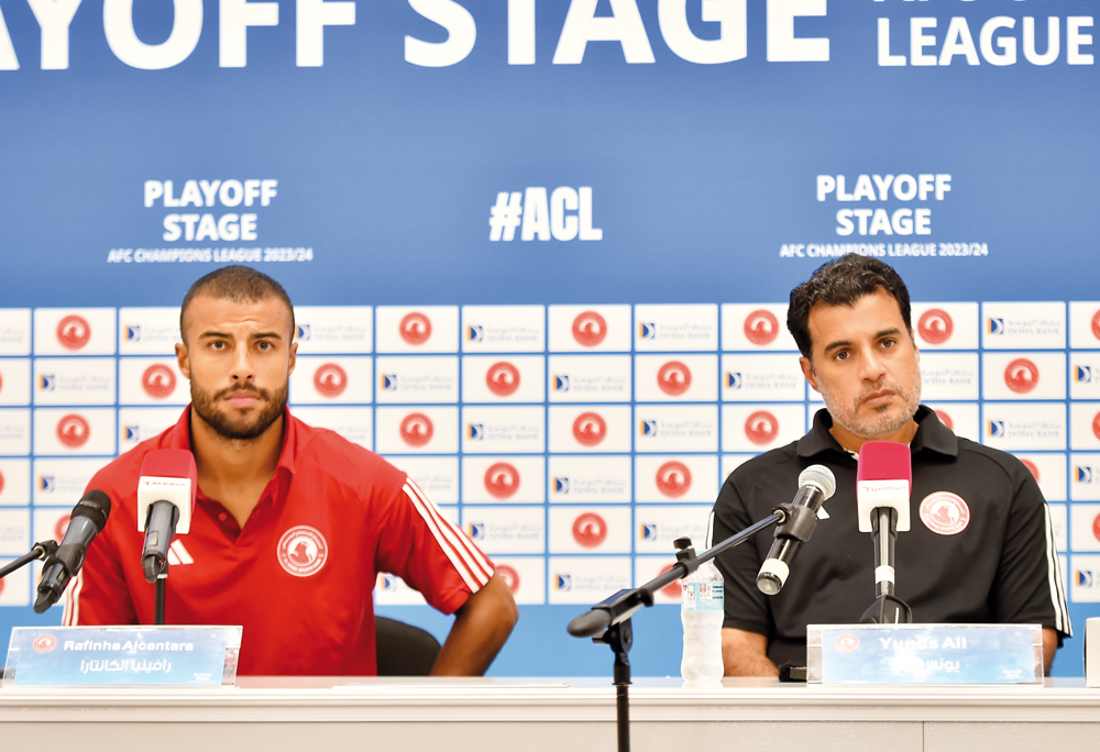Al Arabi coach Younis Ali (right) speaks during a press conference, yesterday. Pic: Abdul Basit