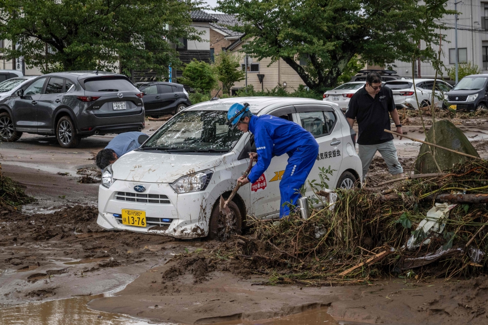 People remove mud to dislodge a car following flooding in Wajima city. (Photo by Yuichi Yamazaki / AFP)