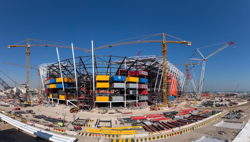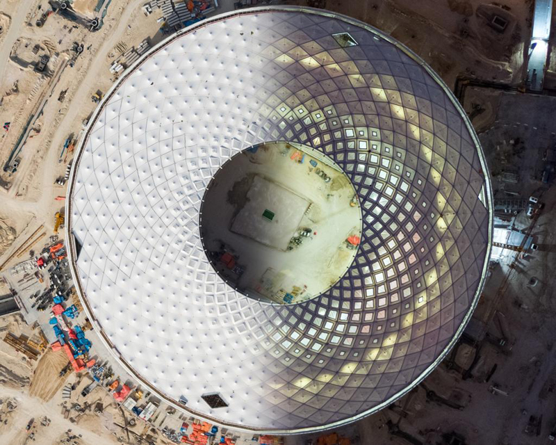 Construction update: The stadium will be built using 998 modular containers, with the delivery and installation of all remaining containers now completed. This includes special containers for the completed Kahramaa Primary Substation. All remaining structural steel members, including tension rods, have also been delivered and installed. Installation of all seats in the stadium’s bowl has also been completed.