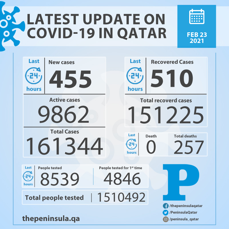 Doha: Ministry of Public Health (MoPH) today reported 455 new cases of coronavirus (Covid-19) and 510 people recovered from the virus in the last 24 hours, bringing the total number of people recovered in Qatar to 151,255.