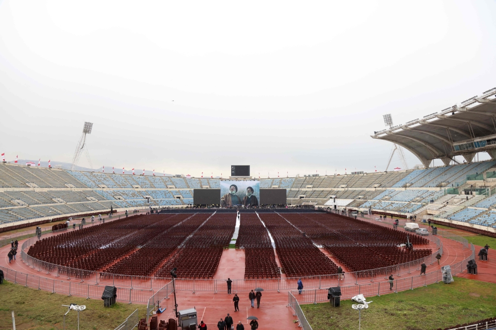 People visit Beirut's Camil Chamoun sports city, as preparations are made a day ahead of the funeral ceremony, on February 22, 2025. (Photo by Ibrahim Amro / AFP)
