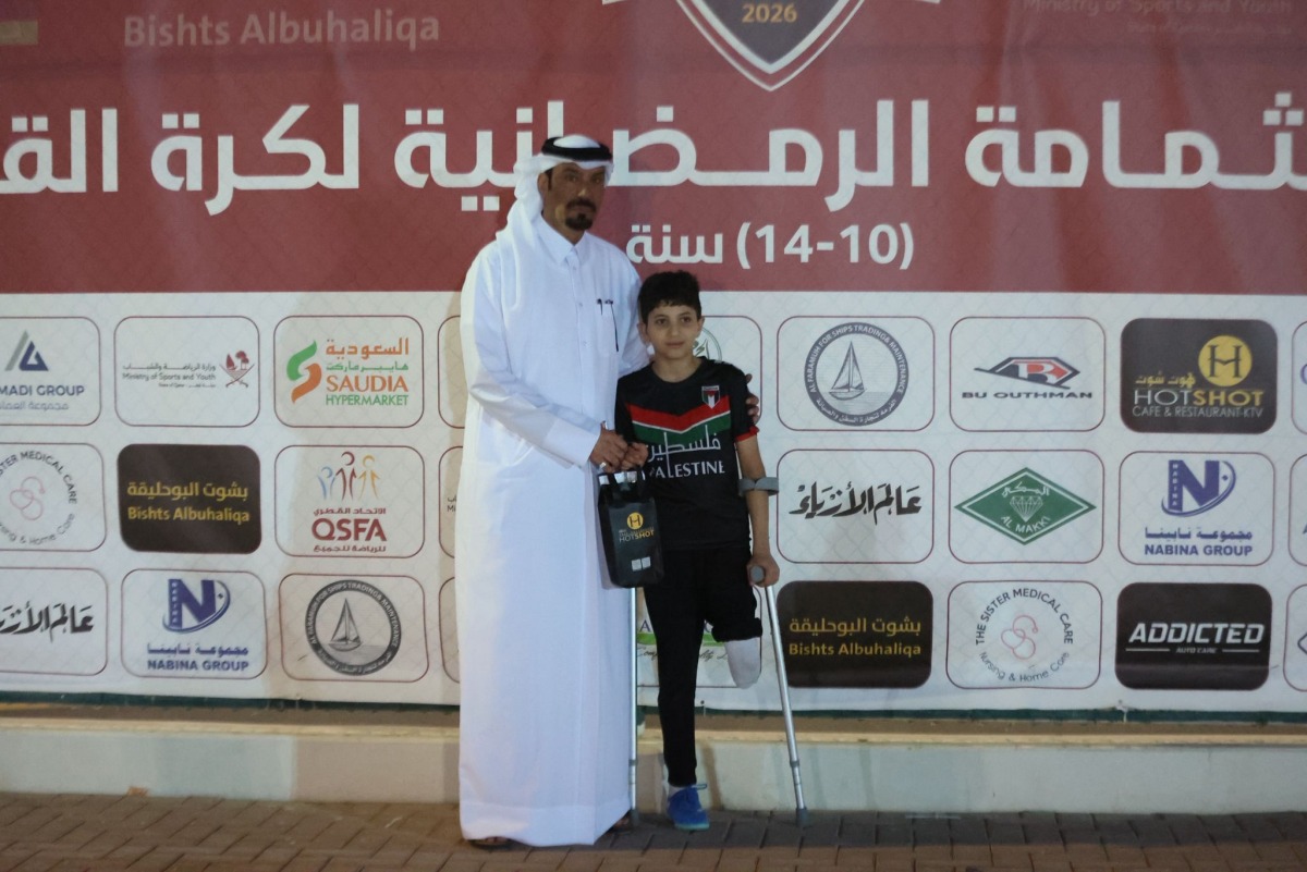 The Palestine-Al Shaqab match witnessed a touching humanitarian gesture, as Hassan Al Ishaq, Chairman of the Organising Committee and member of the Municipal Council, honoured a Palestine team supporter who was injured during the recent war on Gaza.
