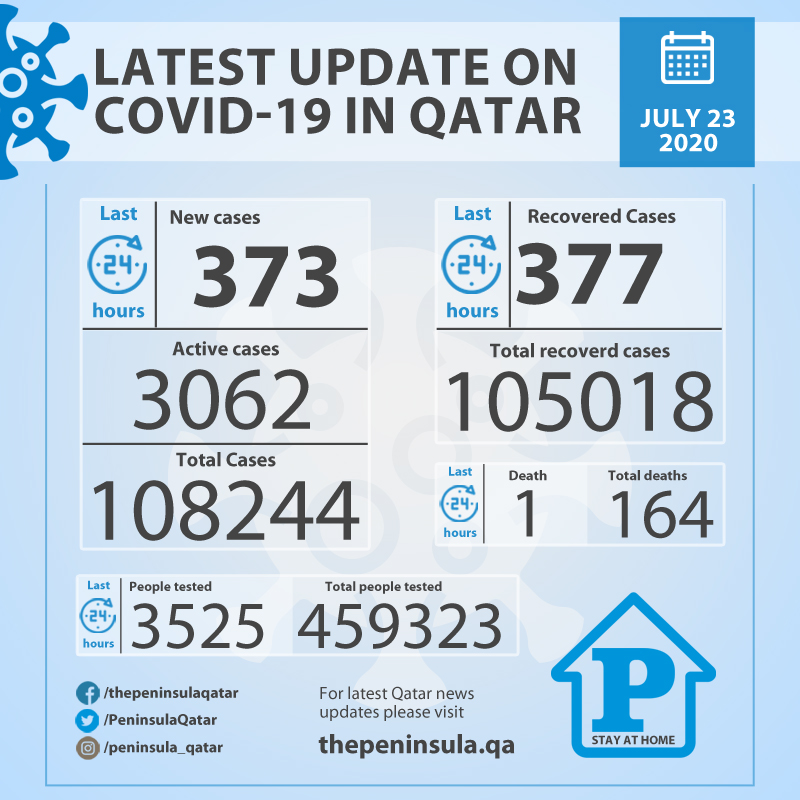 Ministry of Public Health today recorded 373 new cases of coronavirus (COVID-19) and 377 people re-covered from the virus in the last 24 hours, bringing the total number of people recovered in Qatar to 105018. The Ministry also announced one death due to Covid-19.