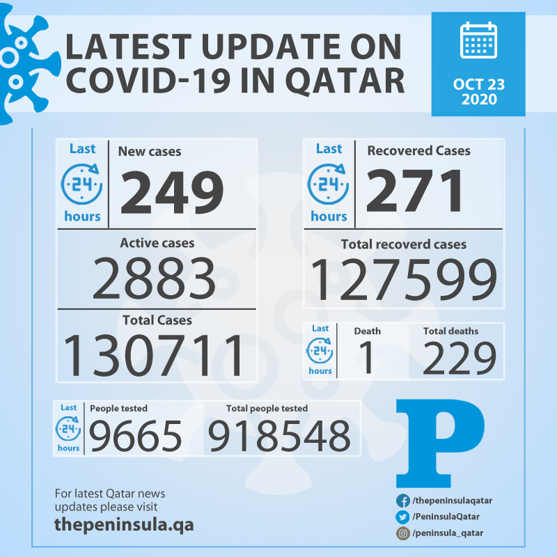 Doha: Ministry of Public Health (MoPH) today recorded 249 new cases of coronavirus (COVID-19) and 271 people recovered from the virus in the last 24 hours, bringing the total number of people recovered in Qatar to 127,599.
