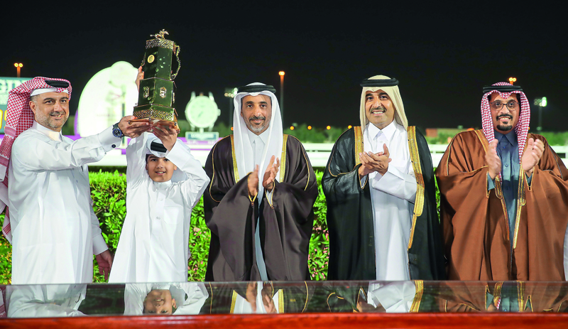 The owners of Full Moon celebrate with the Qatar Derby (Gr 1) trophy after receiving the same from Minister of Culture and Sports H E Salah bin Ghanem Al Ali at the Qatar Racing and Equestrian Club (QREC) yesterday. Ridden by Ryan Curatolo,  Full Moon last night produced a spectacular late surge to win the $500,000 prize.