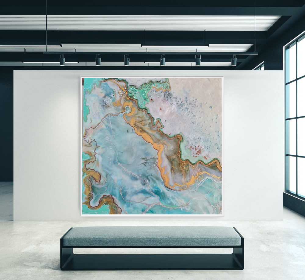 I haven’t seen any other artists using resin on large canvas and I think this is key in my differentiation from other artists out there. It is a challenging process and takes a number of years and dedication to master as there are many technical aspects to bear in mind when working with this medium on canvas, such as horizontal levelling and knowing what’s the perfect ratio (weight) of resin to use.