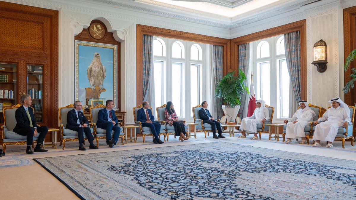 Doha, Qatar: The Amir HH Sheikh Tamim bin Hamad Al Thani received, in his office at the Amiri Diwan, a delegation of Their Excellencies members of Parliament in the friendly United Kingdom, headed by HE Alun Cairns, Member of Parliament, Chairman of the Parliamentary Group for all parties concerned with the State of Qatar, on the occasion of their visit to the country to participate in the Qatar Economic Forum 2023.
