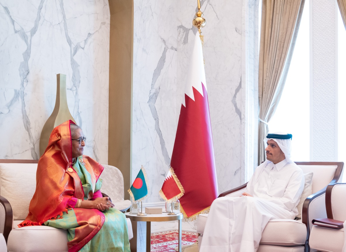 Prime Minister and Minister of Foreign Affairs H E Sheikh Mohammed bin Abdulrahman bin Jassim Al Thani meeting Prime Minister of Kazakhstan H E Alikhan Smailov and Prime Minister of Bangladesh H E Sheikh Hasina Wazed (below) on the sidelines of Qatar Economic Forum yesterday.