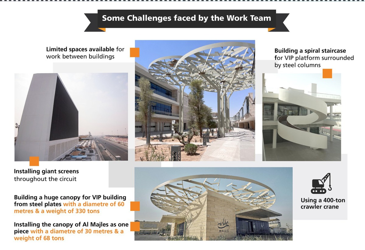 Eng. Ahmed Abu Nahia stated that the works of the Lusail International Circuit Upgrade Project included the installation of many complex and heavy steel structures, each of which had its own challenges that faced the project team.