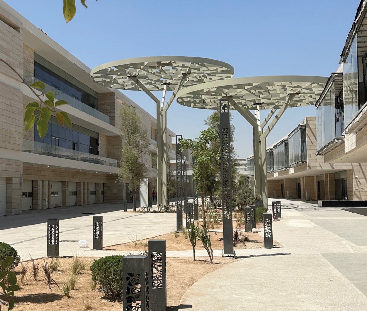 Eng. Ahmed Abu Nahia explained that constructing the VVIP building’s canopy was the most difficult task in the project, as this huge canopy has a diametre of 60 metres and a total weight of 330 tons. It consists of steel plates arranged in a unique design to give the shape of tree branches. To be able to construct the canopy with this large weight and in the required shape, the canopy was divided into main and subsidiary parts to be assembled on site and installed in several stages using a 400-ton crawler crane.