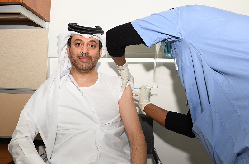 Dr. Abdullatif Al Khal, Sheikh Dr. Mohammed Al-Thani, Dr. Hamad Eid Al Romaihi, Dr. Soha Al Bayat and Dr. Muna Al Maslamani received the vaccination shot.