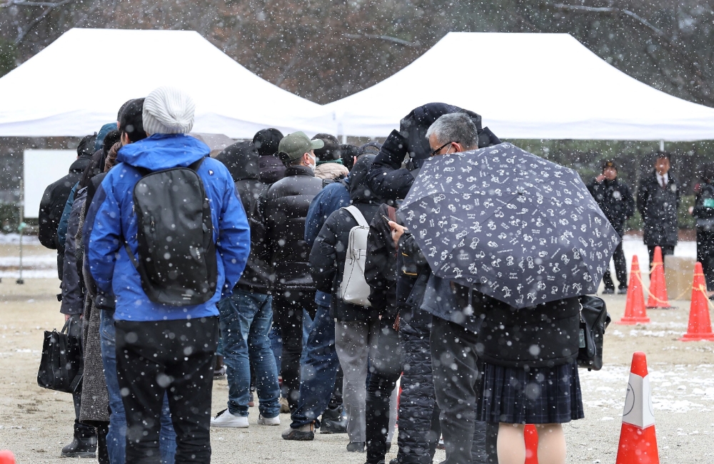 People line up for trial tickets before the verdict in the Kyoto Animation arson murder case in Kyoto on January 25, 2024. Photo by JIJI Press / AFP