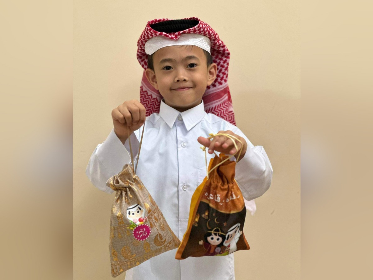 Ethan, 6 years old, dressed in a Qatari traditional attire during Garangao