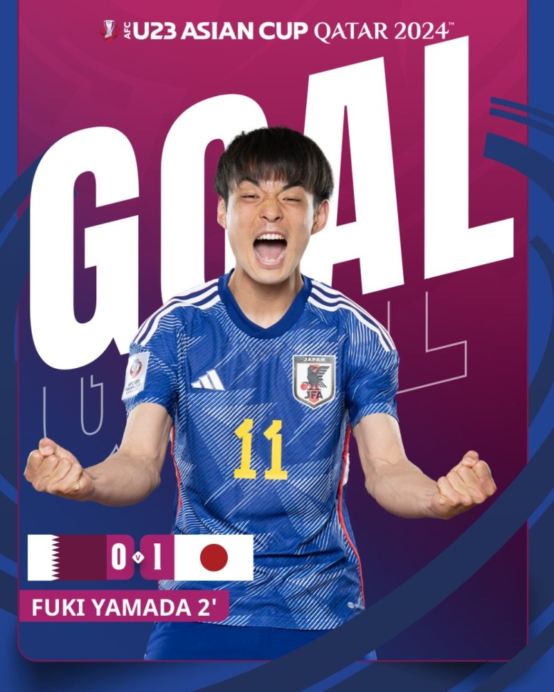 2' Goal! Qatar U23 0, Japan U23 1. Fuki Yamada (Japan U23) left footed shot from outside the box to the top right corner.