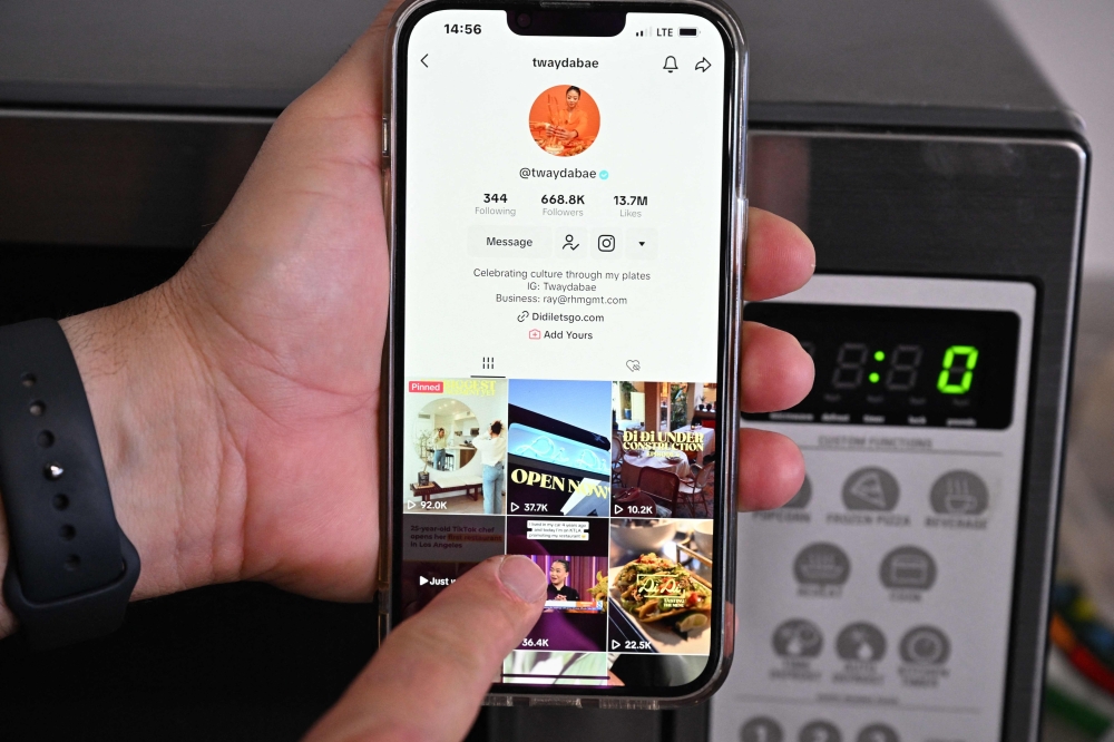 A person looks at the Tik Tok account of Chef Tue Nguyen, in Los Angeles on July 24, 2023. (Photo by Robyn Beck / AFP)